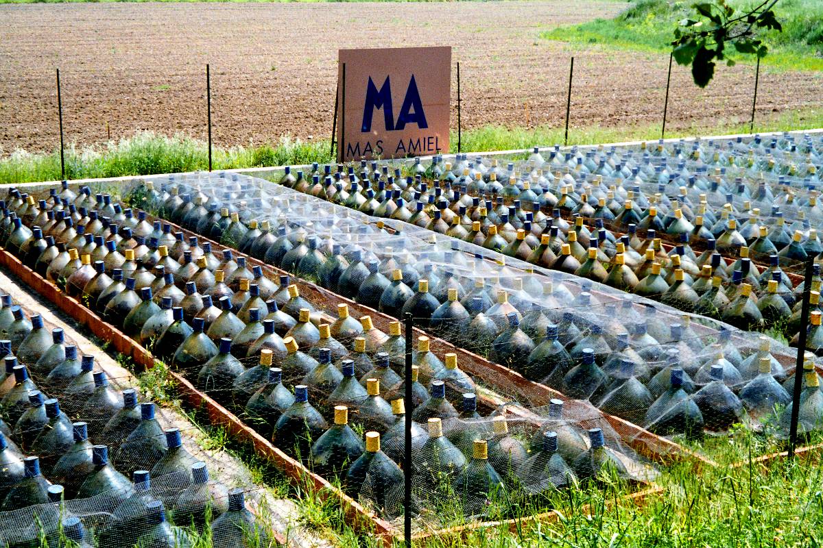 Podobnie jak poprzednie zdjęcie dnia, także i to pochodzi z mojej krótkiej (i jak dotąd jedynej) wizyty w roku 2004 w Roussillon. Odwiedziłem wówczas m. in. jedną z najbardziej znanych posiadłości w Maury, Mas Amiel (link do strony masamiel.fr w tej chwili nie działa). Jedną z jej specjalności były wówczas i są nadal wina wzmacniane, robione w tradycyjny, utleniony sposób, a jeden z etapów ich produkcji obejmuje starzenie w szklanych gąsiorach (nazywanych tam bonbonne) wystawionych na upał i pełne słońce (zdjęcie zrobiłem w czerwcu). Po sezonie letnim tak starzone wina są butelkowane osobno i są nazywane wówczas rancio, lub są dodawane do win starzonych bardziej tradycyjnie, w dębowych beczkach. Rancio to rzadki dziś i coraz bardziej niemodny styl win (trochę podobny do porto tawny i do mader, choć różnice są bardzo wyraźne, od mader różni te wina przede wszystkim wyraźnie niższa kwasowość, a także niższa zwykle zawartość alkoholu), a szkoda, z wielką przyjemnością do nich wracam, gdy tylko mam okazję. Wina słodkie z Mas Amiel miały w Polsce kilku importerów, ostatnio widziałem coś w wina.pl, ale nie w tym tradycyjnym stylu.