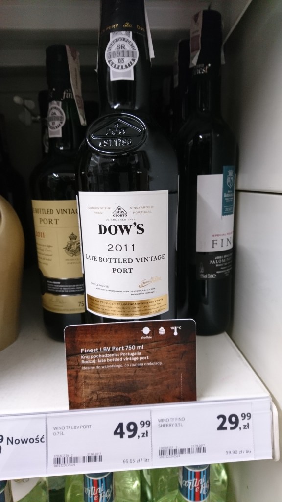 Jedna z najbardziej znanych marek z Porto, należąca do rodziny Symingtonów, tu w wersji late bottled vintage, ze świetnego rocznika, za jedyne 49,99 zł, co jest ceną zbliżoną do najlepszych cen za to wino w Portugalii. Dow’s LBV 2011 to bardzo dobre wino, nie przesadnie słodkie, przy całym dość intensywnym owocu w aromatach ma coś delikatnie zielonego, odświeżającego, pije się je świetnie (i niebezpiecznie łatwo!). Nie jest to może szczyt hedonistycznej ekspresji porto, ale jego bardziej stonowana, elegancka i – co podkreślę raz jeszcze – bardzo pijalna odsłona. Szybko wróciłem po kilka następnych butelek, przy okazji dokonałem jeszcze jednego kontrolnego zakupu (pewnie można się domyślić co kupiłem, patrząc uważnie na zdjęcie 😉 – o wynikach kontroli wkrótce napiszę). Nie wykupiłem wszystkiego, więc jeśli lubicie porto, to pędźcie (na przykład na piechotę!) do Waszych TESCO, naprawdę warto.
