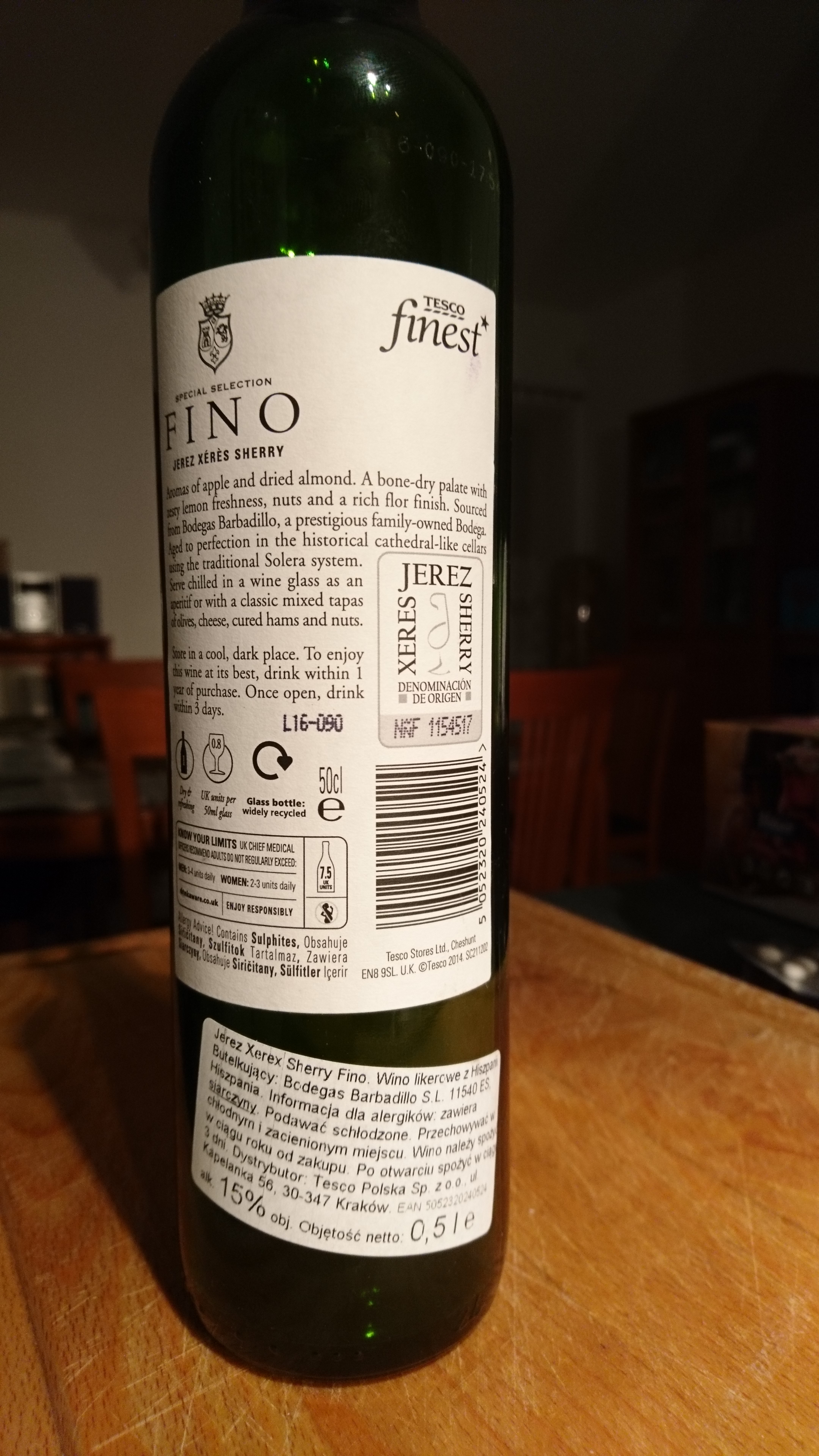 Nieco ponad rok temu pisałem o znalezionych na półce w Tesco sherry butelkowanych dla własnej marki supermarketu, Tesco Finest, przez znanego producenta Barbadillo. Wyraziłem wówczas nadzieję, że nie będzie to akcja jednorazowa i że po nowe wersje tych win będziemy mogli sięgać i w przyszłości. Jak to z marzeniami bywa, czasem się spełniają, rzadko jednak w całej rozciągłości. Gdy tydzień temu po dłuższej nieobecności zajrzałem do mojego lokalnego Tesco (o wizycie pisałem już tu), na półce dostrzegłem wciśnięte między różne butelki porto znajome sherry fino, o którym pisałem rok temu.